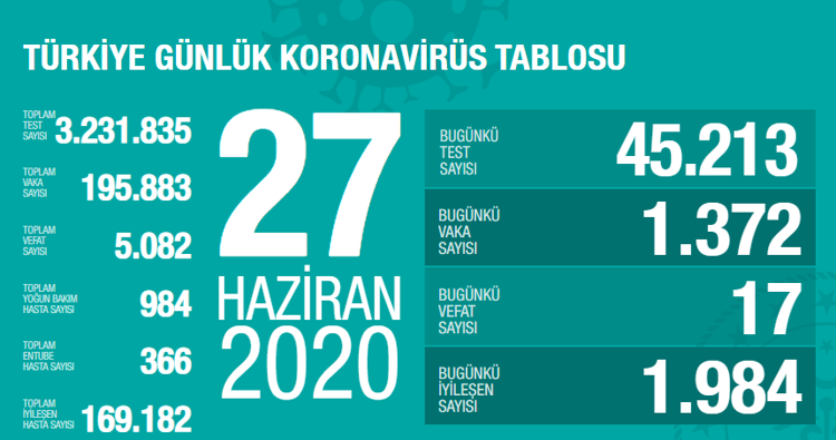 27 haziran pazar günü türkiye'de bugün koronavirüsten kaç kişi öldü, kaç kişi iyileşti konularında aramalar yapılırken.
