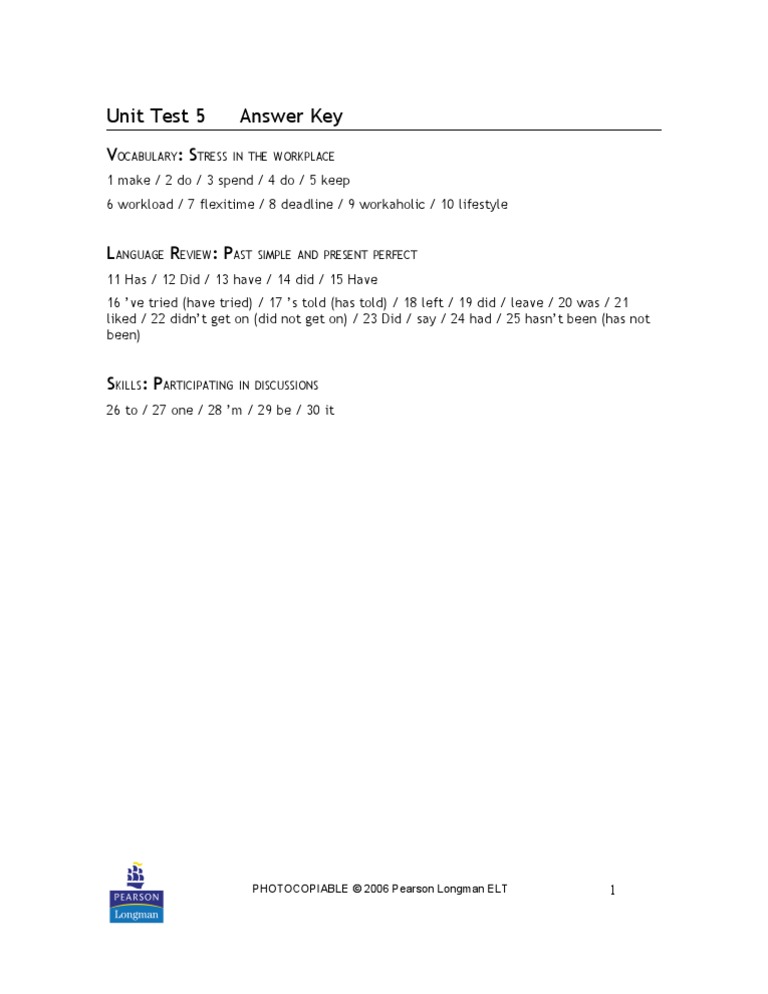 Nitrogen and fluorine cao nf3 3. Show your work for each problem to receive credit. Guard your test and conduct yourself properly. 2 1 clear 2 bit of 3 stamina 4 tone 5 effort. Organise your work into paragraphs use an informal style use descriptive words and phrases use direct speech include details of why. 1 1 sickly 2 greasy 3 acidic 4 spicy 5 vegetarian 5 exotic. The main purpose of the first paragraph is to establish the passage's setting by describing a place and an object. Choices b, c, and d are incorrect because in the context of selling products by manipulating user reviews, a. Unit 8 test review key. Or, go directly to lesson 126. Was the test too difficult? Unit test 5 answer key.doc. 6 progress test files 1 5 answer key b vocabulary 4 1.